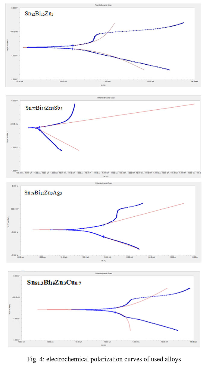 Figure 4 shows electrochemical polarization curves of Sn82Bi15Zn3, Sn77Bi15Zn3Sb5, Sn79Bi15Zn3Ag3 and Sn81.3Bi15Zn3Cu0.7 alloys in 0.25 M HCl. The corrosion potential of used alloys exhibited a negative potential. Also the cathodic and the anodic polarization curves showed similar corrosion trends. The corrosion potential (ECorr), corrosion current (ICorr) and corrosion rate (C. R) of Sn82Bi15Zn3, Sn77Bi15Zn3Sb5, Sn79Bi15Zn3Ag3 and Sn81.3Bi15Zn3Cu0.7 alloys are presented in Table 4. The corrosion rate of Sn82Bi15Zn3 alloy in 0.25 M HCl is decreased by adding Sb or Cu but it’s increased by adding Ag content. That is because adding Sb or Ag or Cu caused a heterogeneous microstructure (more phases) with dissolved atoms in matrix that effected on microsegregation and reactivity of atoms with HCl solution.
