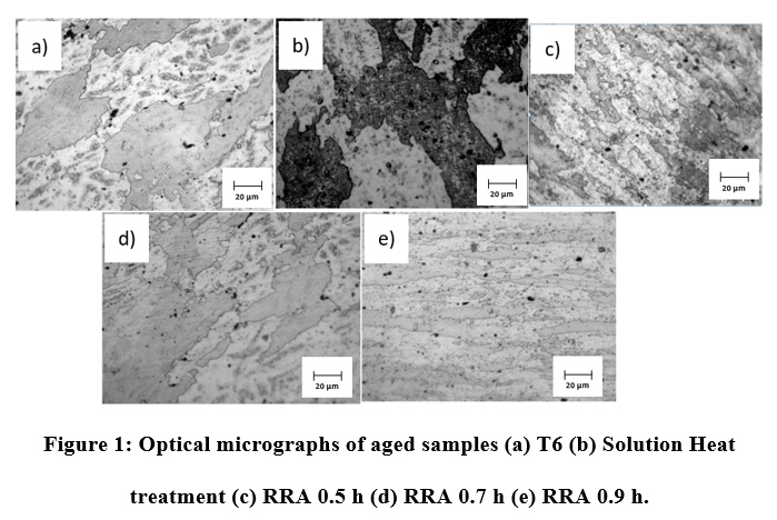 Figure 1: Optical micrographs of aged samples (a) T6 (b) Solution Heat treatment (c) RRA 0.5 h (d) RRA 0.7 h (e) RRA 0.9 h