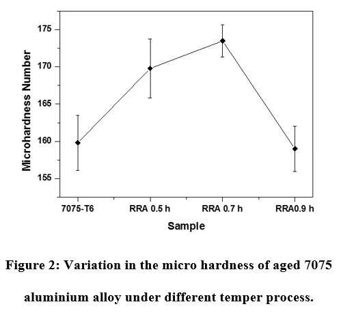 Fig. 2 shows the micro hardness measurements of Aged 7075 Aluminium alloy as a function of the various tempering process. It can be depicted from the figure, that the RRA at 0.7 h shown highest hardness [14]than other samples. The reason behind the increase of hardness is due to formation of η (coherent) and η’ (semi-coherent intermediate) phases in the aluminium matrix.15 However, the rapid decrease of hardness at RRA 0.9 is due to the partially transformation of η Phases to stable η phases in the alloys. It can be understood that the decrease of hardness further 0.7 h is due to over aging.16
