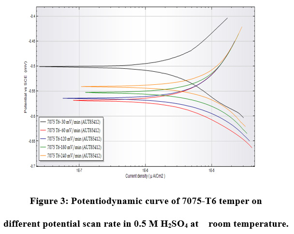 Figure 3: Potentiodynamic curve of 7075-T6 temper on different potential scan rate in 0.5 M H2SO4 at    room temperature