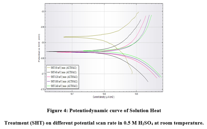 Figure 4: Potentiodynamic curve of Solution Heat Treatment (SHT) on different potential scan rate in 0.5 M H2SO4 at room temperature