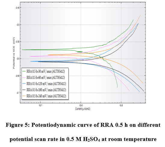 Figure 5: Potentiodynamic curve of RRA 0.5 h on different potential scan rate in 0.5 M H2SO4 at room temperature