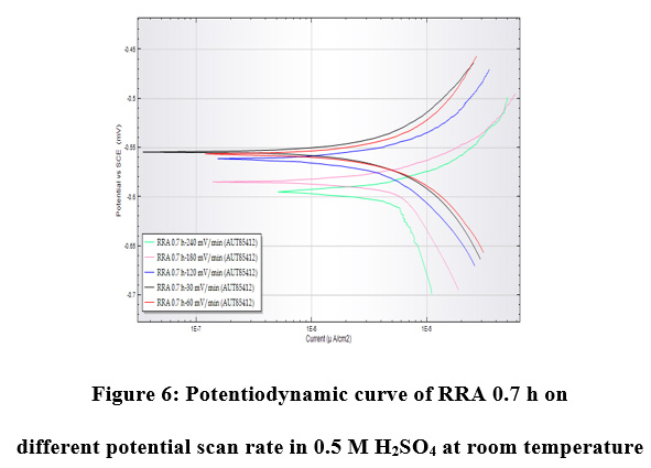 Figure 6: Potentiodynamic curve of RRA 0.7 h on different potential scan rate in 0.5 M H2SO4 at room temperature