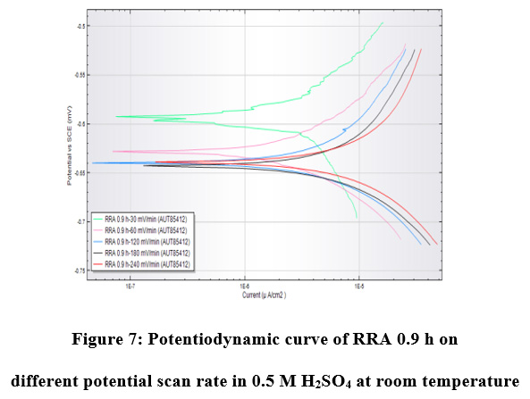 Figure 7: Potentiodynamic curve of RRA 0.9 h on different potential scan rate in 0.5 M H2SO4 at room temperature