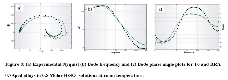Figure 8: (a) Experimental Nyquist (b) Bode frequency and (c) Bode phase angle plots for T6 and RRA 0.7Aged alloys in 0.5 Molar H2SO4 solutions at room temperature