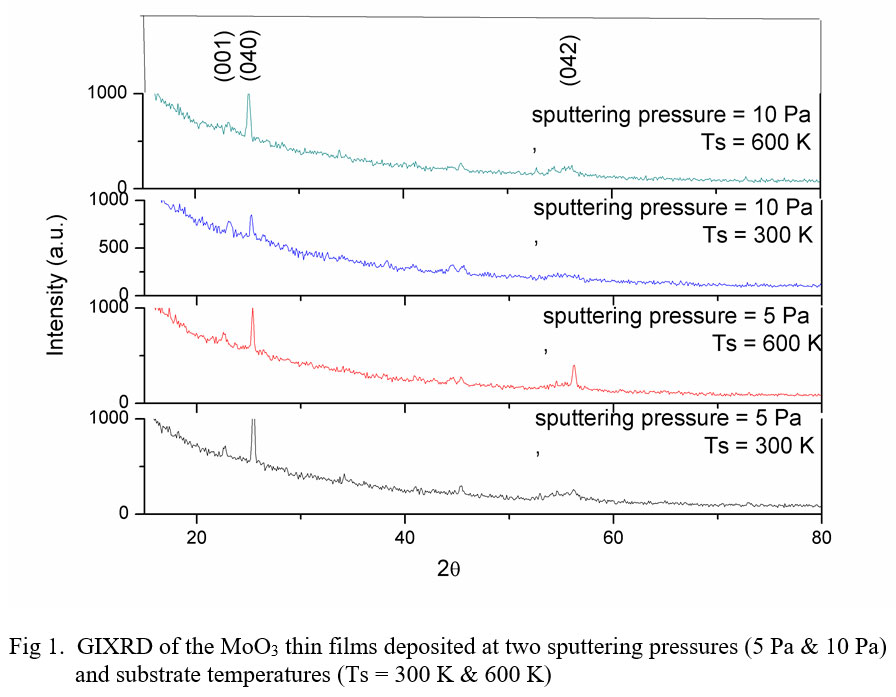 Transition metal oxides are an important class of solids with n-type conductivity and find many applications in thin film form.1,5 Among transition metal oxides MoO3 exhibits an improvement in its various physical and chemical property as a nano material.6,10 Among various physical properties exhibited by MoO3 electrochromism and photochromism is an interesting physical property which find many applications in making display devices and smart windows.9,12 Recent studies also proved that MoO3 is potential as an ion conducting layer in fabrication of solar cells,13 and as recombination barrier layers in dye sensitized solar cells.14 Electrochromism is a phenomenon exhibited by a material in the form of changing colour when the electric voltage is applied to it. In case of MoO3 this is observed due to the reduction of Mo6+ to Mo5+ by application of electric field. The same MoO3 as thin film and especially as nanocrystalline exhibit an improvement in electrochromic behaviour, like enhancement in ionic conductivity, coloration efficiency, optical density, fast response etc.15 Nano crystalline MoO3 thin films which were deposited at two different substrate temperatures and sputtering pressures and studied for their structural, optical and electrochromic performance in the present investigation.