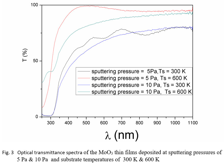 The optical transmittance spectra of the films was studied to understand the optical quality and type of electron transition in the films. In the present investigation the optical transmittance of the films deposited at 5 Pa, 10 Pa and 300 K, 600K is shown in Fig. 3. The film transmittance when deposited at 5 Pa and 300 K is 81 % and increasing with increase in substrate temperatures. The absorption edge is shifts towards lower wavelengths with increasing substrate temperature and shifting towards higher wavelength with sputtering pressure. The reason for increase in transmittance of films deposited at higher temperature is due to high reactivity between Mo and oxygen leading to stoichiometric film. More over these stochiometric films also shows the shift in absorption edge towards lower wave length due to band gap widening which further results in increment in the energy gap.15,22,23