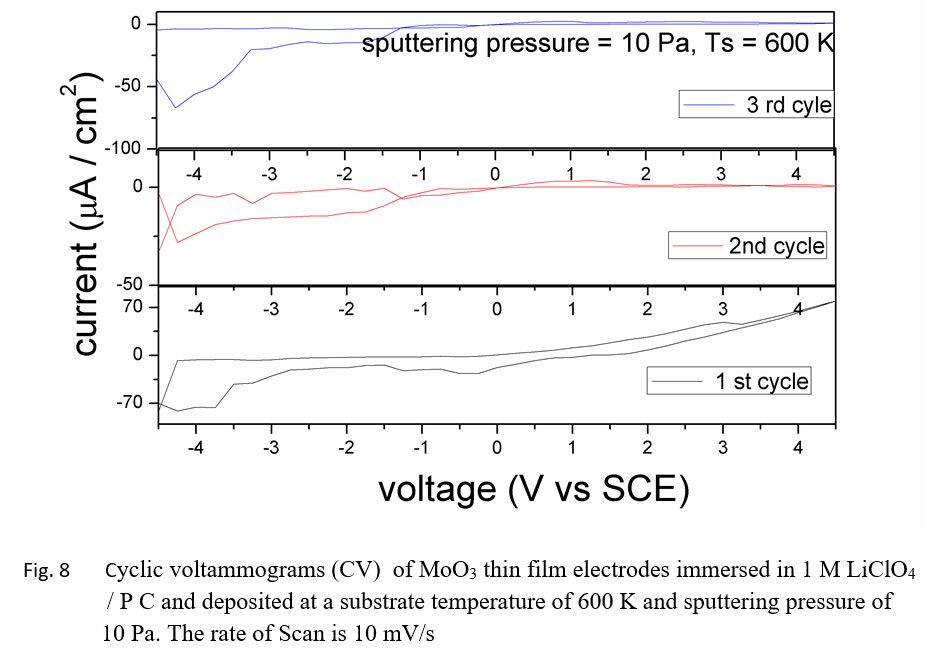 The linear sweep cyclic voltametry (CV) studies were performed on the sample to find the reduction potentials and diffusion coefficient of lithium ion in MoO3 films. The CV studies of the films were performed in a three electrode cell. Platinum is used as a counter electrode, Hg / Hg2Cl2 used as a reference (SCE) and MoO3 films deposited on Indium Tin Oxide (ITO) coated substrates is used as working electrode.