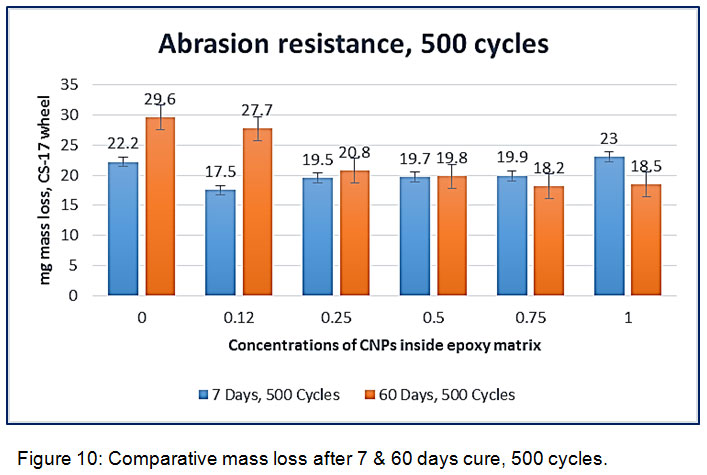 Two different sets of specimen were prepared simultaneously using same material and similar application process for abrasion resistance study of b-CNPs-ENC coating. Coated specimen were tested at different time intervals to understand the effect of clay nanolayers inside Diglycidyl ether of bisphenol A epoxy matrix with cure time. The first set of experiment was performed after 7 days and that of second set after 60 days of curing. Both studies were performed after conditioning the test specimen in similar laboratory condition at 23+/-2°C temperature and 55% relative humidity (RH).