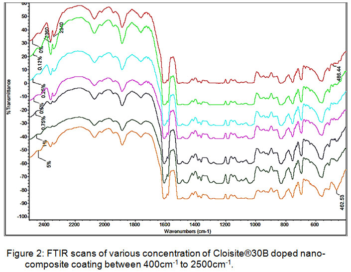 Figure 2: FTIR scans of various concentration of Cloisite®30B doped nano composite coating between 400cm-1 to 2500cm-1.
