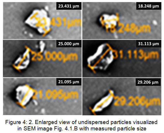 Figure 4: 2. Enlarged view of undispersed particles visualized in SEM image Fig. 4.1.B with measured particle size