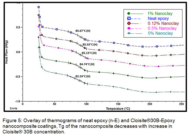 The glass transition temperature (Tg) of neat epoxy (n-E, 0%) and epoxy nanocomposite coatings (NCCs) in various concentrations viz. 0.12%, 0.5%, 1.0% and 5.0% were determined using differential scanning calorimeter (DSC) of TA Instrument model Q-20. The overlay of thermograms analyzed for various concentrations are given in Fig.5. The Tg is found to be shifting towards lower temperatures with increase in concentration of Cloisite®30B inside Diglycidyl ether of bisphenol A epoxy matrix observed in the thermogram. The lowering in the Tg of Diglycidyl ether of bisphenol A epoxy NCCs can be attributed to the non-cross linking with amine due to masking of reactive oxirane group by clay nanolayers inside polymer matrix. The lowering in Tg of nanocomposites has also been reported earlier in epoxy clay study by DSC analysis29 and by solid state NMR study.30 The glass transition temperature of the bentonite clay epoxy nanocomposite coating studied here in general, gradually decreasing with increase in clay material inside the epoxy matrix. It can be observed that at 0.12% and 0.50% concentration, there is almost negligible reduction in Tg while in case of 1% and 5% concentrations there is minor reduction when compared with neat epoxy coating, listed in Table.2.