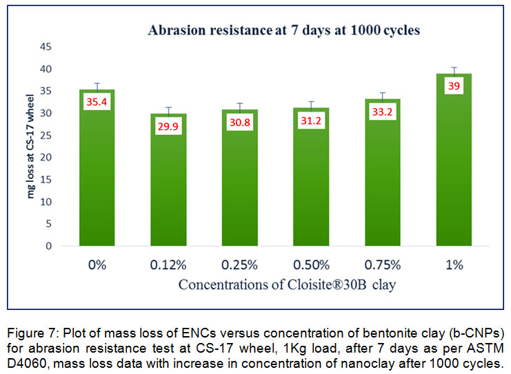 Figure 6: Plot of mass loss of ENCs versus concentration of bentonite clay (b-CNPs) for abrasion resistance test at CS-17 wheel, 1Kg load, after 7 days as per ASTM D4060. A. mass loss data with increase in concentration of nanoclay after 500 cycles