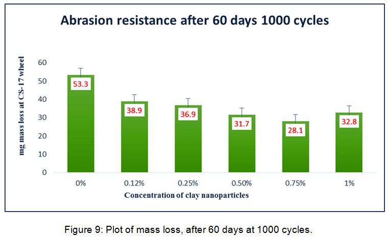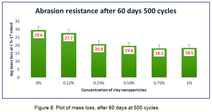 It is noteworthy that the abrasion resistance result of 1% b-CNPs concentration observed a little poorer compared to n-E. The phenomena of improvement in abrasion resistance of the Diglycidyl ether of bisphenol A epoxy polyamine matrix with the introduction of bentonite clay might be attributed to higher compactness of the film due to clay filled Diglycidyl ether of bisphenol A epoxy, interaction of organically modified clay with Diglycidyl ether of bisphenol A epoxy amine matrix (reveled during FTIR study), shape and size of the clay particles and dispersion of particles inside the matrix. When compared among various concentrations, the higher abrasion resistance observed at lower concentration while gradual increase in concentration reduced the abrasion resistance from 0.25 to 1% concentration corroborates that with increase in the clay nanolayers inside matrix the bonding between organic moiety and inorganic clay decreased when cured for a limited period up to 7 days.