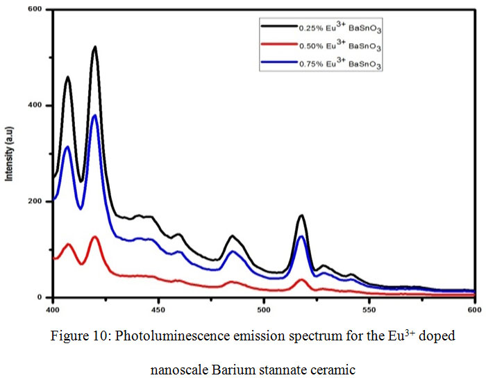Photoluminescence study of the nanoscale Barium stannate ceramic was carried out with the excitation wavelength of 380 nm and following observations were made. In the sample of BaSnO3: 0.25% Eu3+there were emission bands observed at 407.07 nm 420.00 nm, 485.07 nm and 518.05 nm for the sample as shown in Figure-10. There are two sharp and two broad emission bands were observed.In the sample BaSnO3: 0.50 % Eu3+ there Emission bands observed at 407.07 nm, 420.00 nm, 485.07 nm and 518.05 nm for the sample as shown in figure. There are two sharp and two broad emission bands were observed. BaSnO3: 0.75 % Eu3+there were emission bands observed at 407.07 nm 420.00 nm 485.07 nm and 518.05 nm for the sample as shown in figure. There are two sharp and two broad emission bands were observed and  the emission spectra are observed in visible region and correlated with the reports of.12 While 0.50 % doping of Eu3+ at surface of Europium doped Barium stannate ceramic reduces PL intensity and chromaticity of this compound when compared to 0.25% and 0.75 % of Eu3+.