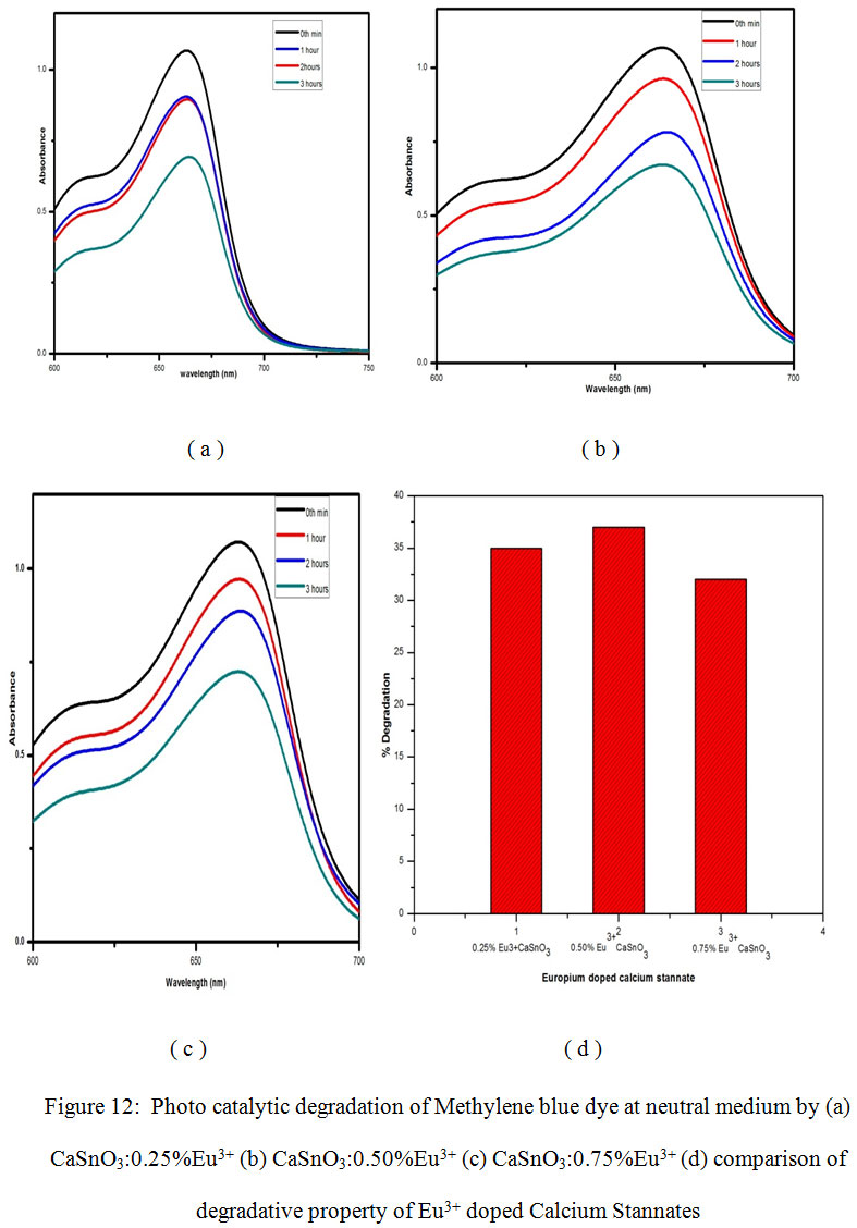 Among the three samples of Eu3+ doped Calcium Stannates, the photo degradative efficiency of 0.50% Eu3+ doped calcium stannate was found to be the highest compared to the other two stannate ceramic against Methylene blue dye was relatively low at the neutral pH as shown in the Figure -12. But it was found to be less efficient than its absence (without the catalyst). It can be concluded that photocatalytic efficiency of calcium stannate and Europium doped are not noteworthy.