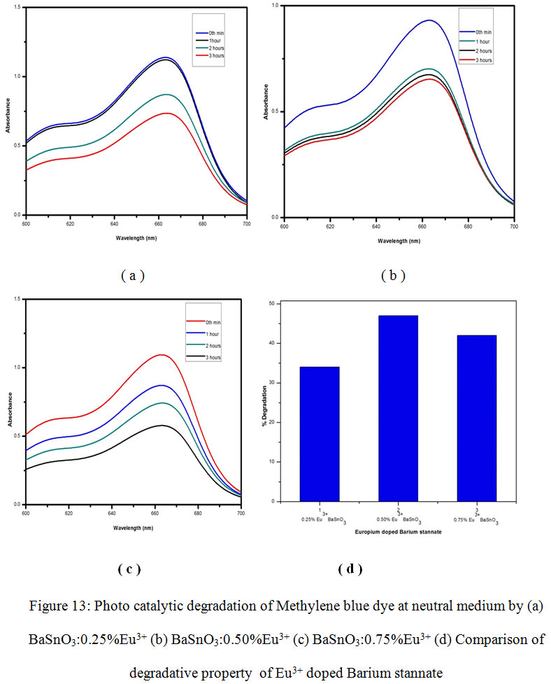 The Photo degradative efficiency of 0.50% Eu3+ doped barium stannate ceramic against Methylene blue dye was relatively higher at the neutral pH compared to other doped samples (0.25% and 0.75% Eu3+) was shown in the Figure-13. This behaviour was like that of calcium stannate.