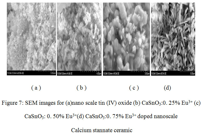 The surface morphological examination of nano scale tin (IV) oxide prepared using aloe vera plant extract and Eu3+ doped nanoscale calcium stannate ceramic as given by SEM images (Figure- 7 (a) near spherical crystallites of nano scale tin (IV) oxide (b) CaSnO3:0.25% Eu3+) showed the formation of near spherical grains with agglomeration. The SEM image of (c) CaSnO3:0.50% Eu3+showed both near spherical and rod like structures indicative of the presence of calcium stannate and Eu2O3 on the surface. The morphological variation may be due to the increasing percentage of Eu3+which was identified by EDAX analysis. In fact, there was a flower like structures of the crystallites. The SEM image (d) CaSnO3:0.75% Eu3+ also showed similar features of near spherical, rod shaped crystallites along with sticks like structure, which could not be accounted for. The surface morphology of Europium doped calcium stannate results correlated well with the PXRD results.