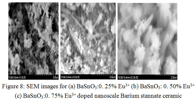 The surface examination of Eu3+ doped nanoscale barium stannate ceramic as given by SEM images (Figure- 8 (a) BaSnO3:0. 25% Eu3+ ) showed.,  near spherical, stick and rod like structure with agglomeration of particles. The stick morphology of the sample was reported at higher calcinations temperature of 1200°C and was due to the presence of barium carbonate.8,9 In the sample of (b) BaSnO3:0.50%Eu3+there were more rod like structures and near spherical due to increasing percentage of Eu3+ on the stannate surface. In the sample of (c) BaSnO3:0.75% Eu3+there was well developed spherical crystallites with lesser rod like structures. These observations clearly indicated the effect of doping fractional percentages of rare earth ions on the surface morphology and hence the surface properties of the ceramics. However, the SEM images were supportive of the PXRD results.
