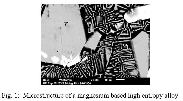 To enhance the usage of magnesium based materials, it is important to develop new magnesium based materials using both compositional control and composite technology. Worldwide efforts are being made to develop new magnesium alloys that are superior to currently available alloys in terms of mechanical (hardness, strength, fatigue, creep etc.) and corrosion properties. An example in that direction is the qualification of WE43 magnesium alloys which is recently approved by FAA for aerospace applications. In yet another study, investigators improved the properties of magnesium through compositional control to bridge the gap with steels providing yet another option to materials selectors to diversify the usage of magnesium. 15 More work is also being done to develop high entropy alloys based on magnesium as high entropy alloys normally exhibit complex microstructure and high strength and hardness properties. A typical microstructure of a magnesium based high entropy alloy is shown in Fig. 1.