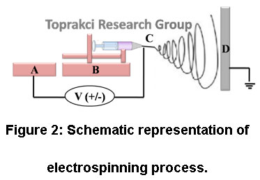 Electrospinning process has four fundamental components (Fig. 2). The first is a high voltage power supply (Fig. 2A) that gives power to get the charged polymer solution into a fiber form. The latter is a syringe pump (Fig. 2B) to control the flow rate of the polymer solution. The third component is the needle to disperse charge on polymer jet (Fig. 2C). The last one is the collector (Fig. 2D) that picks up electrospun fibers by discharging them.11, 12