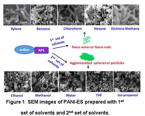 The second set of solvents PANI-ES showed conductivity in the semiconductor region, which showed peaks in between the emeraldine salt and its base. In a similar manner, PANI-ES prepared using first set of solvents with conductivity (>0.3 S cm-1) shows nanowires or nanorods morphology and the PANI-ES prepared with the second set of solvents with lower conductivity (<0.3 S cm-1) shows agglomerated spheres or particles morphology.