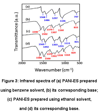 Table 2: Infrared spectral data of PANI-H2SO4 salt and its corresponding base along with the reported PANI salts and their bases