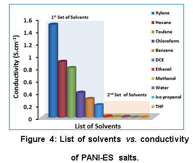 This Table 5 also indicates the correlation between FT-IR spectrums of PANI systems with its conductivity and method of measurement of conductivity of PANI systems. This information is a very useful researcher and industrialists working on PANI systems to find the conductivity level and method of measurements from FT-IR spectrum. Similarly, the conductivity of PANI-ES shows two sets of value (Fig. 4), i.e., >0.3 S cm-1 for the first set of solvents and <0.3 S cm-1 for the second set of solvents.