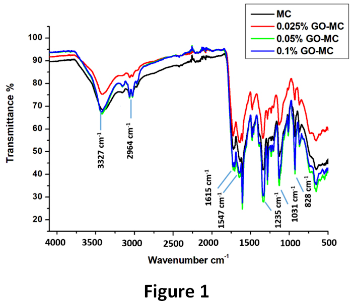 FT-IR spectrums of GO-reinforced and unreinforced PUF-epoxy microcapsules were shown in Figure 1. Characteristic peaks of poly(urea-formaldehyde) shell were seen at 3327cm-1 (N-H stretching), 1615cm-1(C=O bending of urea) and 1547cm-1(N-H bending of urea). Epoxy as core compound is detected at 1031 cm-1 (ether stretching of epoxy), 1235 cm-1(alkyl aryl ether stretching), 1500 cm-1 (C-O-C stretching of phenyl ring) and 828 cm-1, 914 cm-1(C-H and C=C bending of benzene,respectively), 2964 cm-1and 2926 cm-1( CH3 symmetric and asymmetric stretching of methyl groups, respectively).12 GO could not characterize due to peak overlapping21 and its very low concentration.