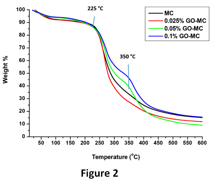 Thermal analysis results were shown in Figure 2. The first degradation temperature for all samples was 225 °C, so, this result shows that produced PUF-epoxy microcapsules are resistant up to 225 °C.9 Moreover, GO reinforced microcapsules show two-step degradation behaviour that proves the GO existence. This two-step degradation behaviour could not be seen in 0.25 GO-MC samples since the amount of GO is too low to effect the thermal behaviour. Moreover, 2nd step degradation begins at 350 °C that indicates degradation of the GO and epoxy in the of GO-reinforced microcapsules.9 1% GO-MC has more weight loss ratio at 2nd degradation step due to higher GO concentration.23