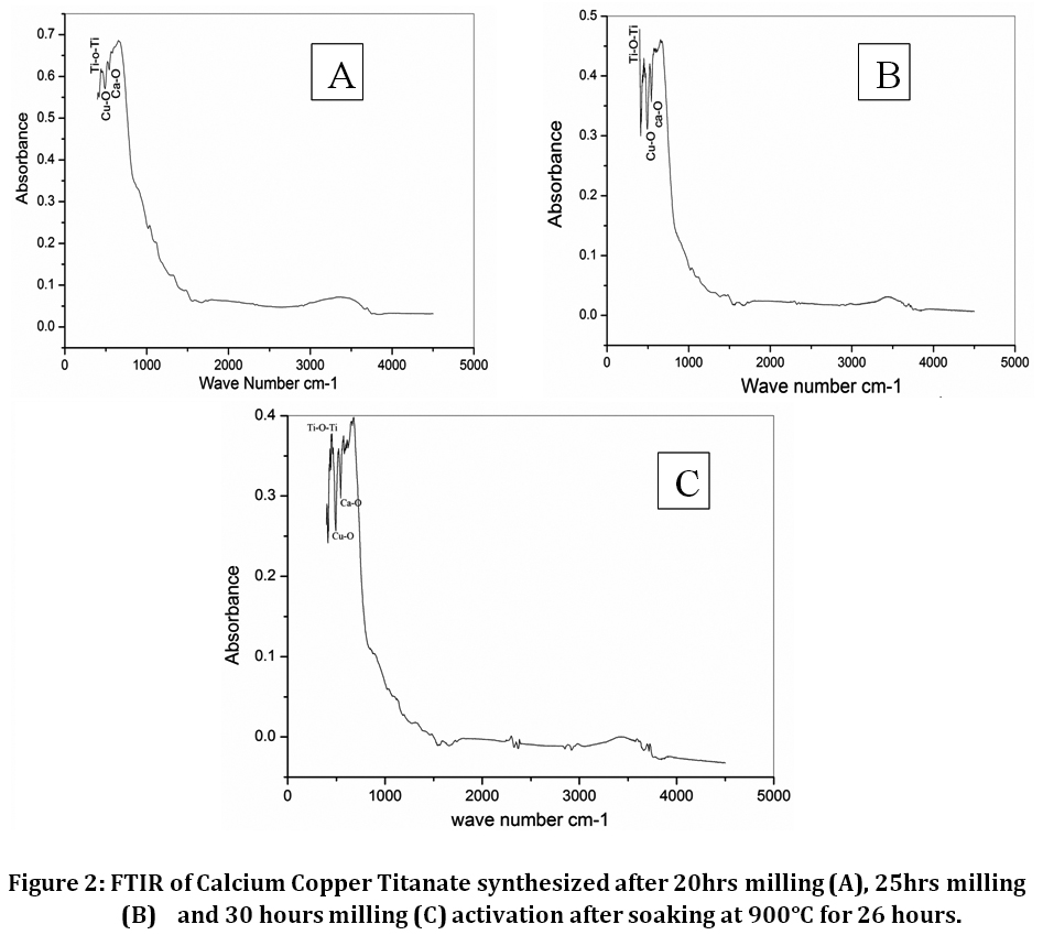 Figure 2: FTIR of Calcium Copper Titanate synthesized after 20hrs milling (A), 25hrs milling (B) and 30 hours milling (C) activation after soaking at 900°C for 26 hours.