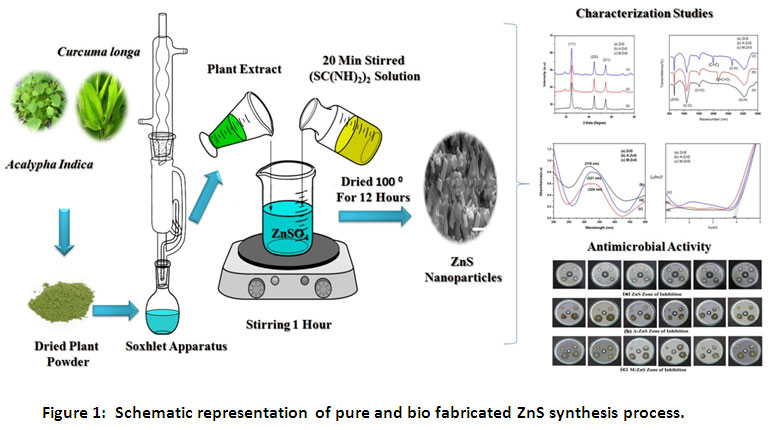 The bio-fabrication of ZnS nanoparticles were prepared by using 20 ml plant extract and 1:1 molar ratio of ZnSO4.7H2O (zinc sulfate) and NH2CSNH2(thiourea) as a source materials. The bothZnSO4.7H2O and NH2CSNH2were dissolved in 50 ml of deionized water in two different beakers and the mixtures was stirred 30 min by using magnetic stirrer. While continuous stirring, NH2CSNH2and 20 ml of plant extract solution were added drop by drop into ZnSO4.7H2O solution and the mixture was kept 60 min stirring. The resultant nono-colloidal was formed and it was centrifuged at 2000 rpm for 20 min further it’s heated in air furnace at 1000 C for 12 hours to obtaining fine nanoparticles. Pure ZnS nanoparticles were prepared by same experimental procedure presented above but plant extracts are could not be used for synthesis ZnS, for comparative evaluation prepared ZnS nanoparticles was abbreviated following namely, pure ZnS as ZnS, Acalypha indica and Curcuma longa plant extract as A: ZnS and C: ZnS respectively. Schematic representation for the preparation and antimicrobial activity of Biosynthesized ZnS showed in figure 1.