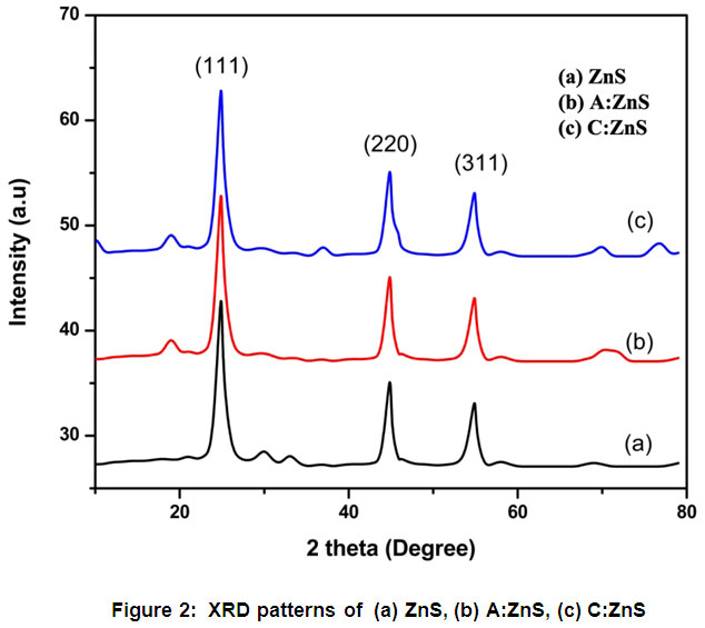 XRD pattern of the prepared ZnS, A: ZnS and C: ZnS samples shown in Figure 2. All the prepared samples exhibits three diffraction peaks well matched with zinc blended cubic structure31 From this XRD results shows any other impurity peaks are not detected and its conformed well formation of ZnS NPs. Figure 2 shows theXRD pattern of prepared samples diffraction peaks indicates the presence of prominent peaks 2θ at 28.90, 48.10 and 57.70 corresponding to the miller indices planes to (111), (220) and (311) reflection of ZnS cubic structure which well matched with JCPDS card no.80-0020.32 The XRD pattern of A:ZnS and C:ZnS NPs shows high intensity diffraction peak at (111) plane so it was the evidence bioactive compound of plant extract helps to improve the crystal growth of ZnS nanoparticles. Table 1 shows the calculated average crystalline size of ZnS nanoparticles using Debye Scherer formula