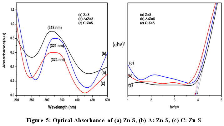 Figure 5 shows the UV-Visible absorbance spectroscopy of prepared samples and all the samples exhibit maximum optical absorbance of 75% was observed. The high absorption peaks at 318 nm, 321 nm and 324 nm for ZnS, A: ZnS and C: ZnS respectively. The bio fabricated ZnS having maximum absorption were found red shifted for ZnS. Tauc’s plot has been used to calculate band gap energy.33