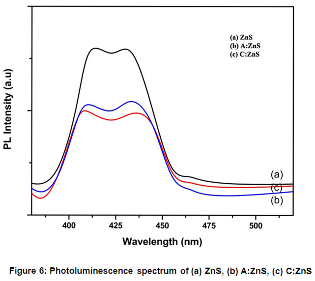 The band gap energy was increased efficiency due to the minimum transition of an electron from the valence band to conductance band. The photoluminescence (PL) spectrum of all the prepared ZnS NPs samples excitation wavelength is 320 nm. The broad peak appearance at 408 nm and 428 nm due to the presence of sulphur and zinc vacancies of all the prepared ZnS samples because PL spectra large intensity depend on the crystalline size and large surface volume ratio of NPs. The Pure ZnS NPs depicts a strong intensity than all other plant extract capped ZnS NPs. C: ZnS NPs intensity was increase due to higher surface volume ratio and smaller particle size of A: ZnS NPs it is shown in Figure 6.