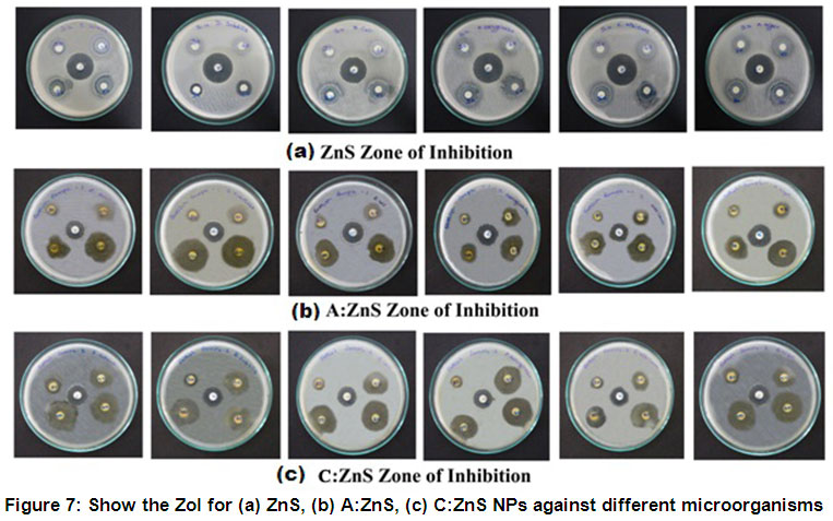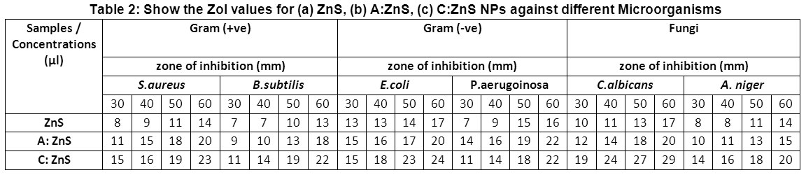 Table 2: Show the ZoI values for (a) ZnS, (b) A:ZnS, (c) C:ZnS NPs against different Microorganisms
