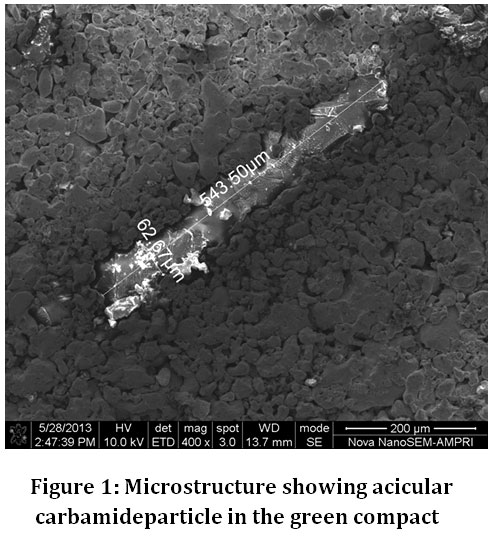 Figure 1: Microstructure showing acicular carbamide particle in the green compact