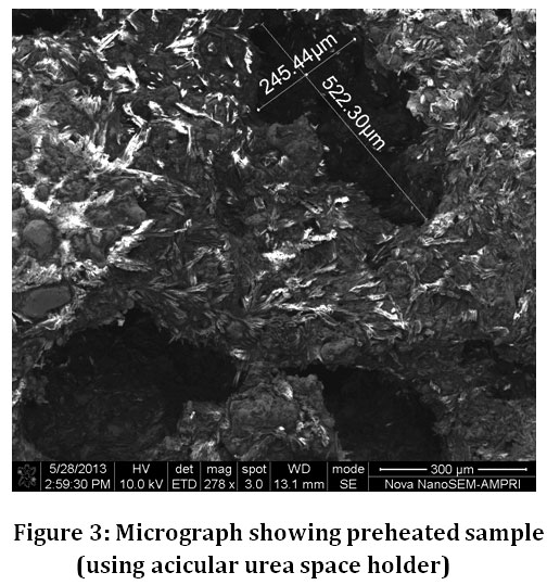 Figure 3: Micrograph showing preheated sample (using acicular urea space holder)