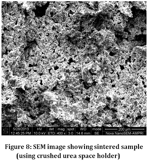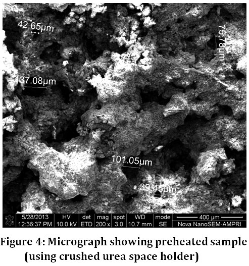 Due to the evaporation of urea particles, whether acicular or crushed, during preheating of green compact samples the pores gets produced. The pores obtained are larger in case of samples resulted from acicular urea than that of crushed urea particles due to deformation and distortions resulted by an increase in temperature and evaporation. Pores dimension are more compared to the size of urea particles since urea particles vaporise after destroying the mechanical bonds that created high dimension voids.