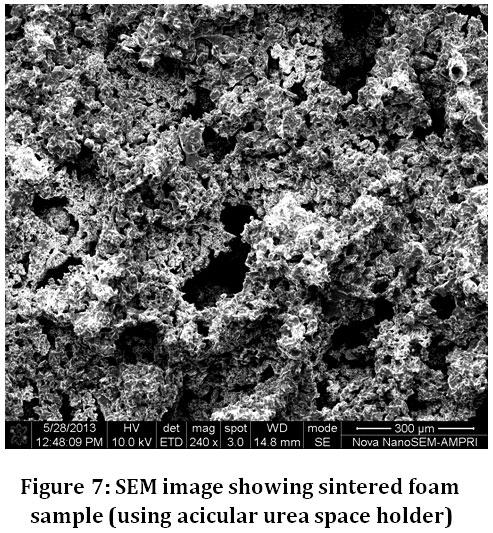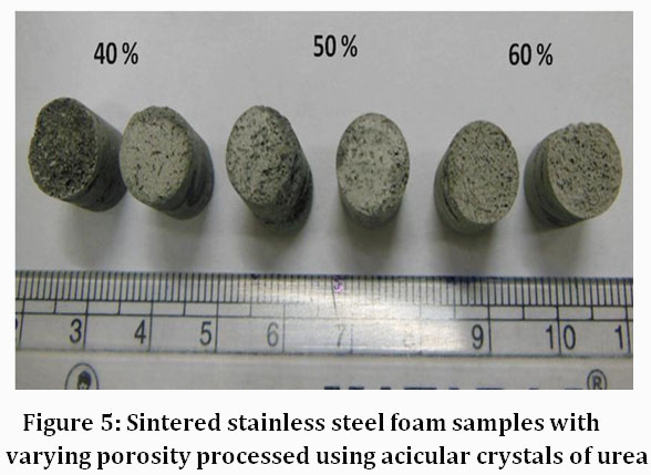 Thus stainless steel foams could be successfully processed through powder metallurgy and ureacan be efficiently used as a space holder. Alsothe amount of porosity and material density is directly proportional to the amount of space holder usedThe pores dimensions produced depends on the nature of space holder utilized, sintering temperature and time interval of preheating &sintering.