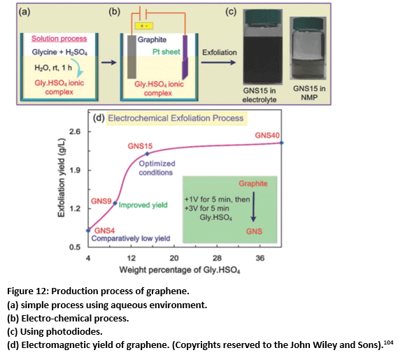 Figure 12: Production process of graphene. (a) simple process using aqueous environment. (b) Electro-chemical process. (c) Using photodiodes. (d) Electromagnetic yield of graphene. (Copyrights reserved to the John Wiley and Sons).104