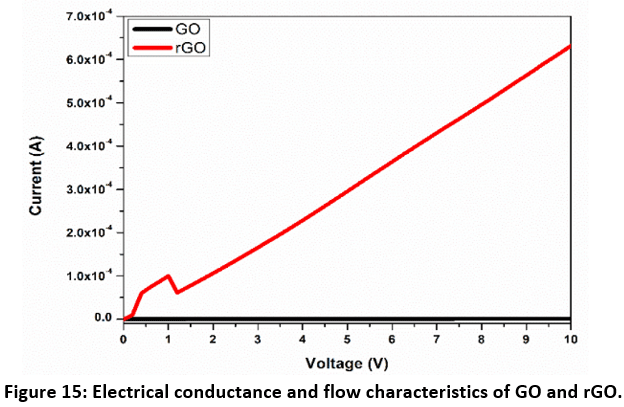 Figure 15 demonstrates the electrical attributes bends of GO and rGO. It shows, rGO flows current better than normally oxidized graphene which makes it more conductive in nature. This is because of the oxygen loss in rGO.6 But more oxygen groups make GO a powerful thermal insulator. So, both of those products are practically useful for various works. The higher electric conductivity of rGO makes it a proper candidate for optical power transmission.