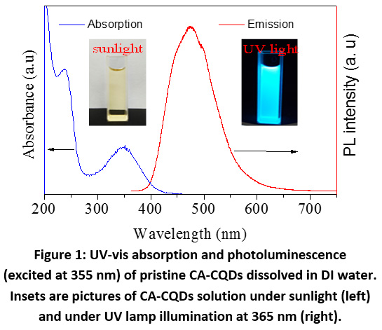Figure 1: UV-vis absorption and photoluminescence (excited at 355 nm) of pristine CA-CQDs dissolved in DI water. Insets are pictures of CA-CQDs solution under sunlight (left) and under UV lamp illumination at 365 nm (right).