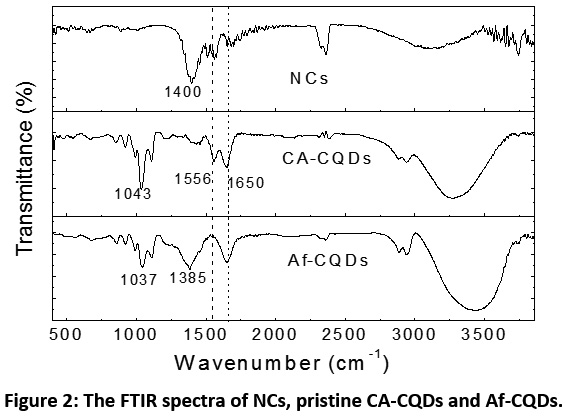 Figure 2: The FTIR spectra of NCs, pristine CA-CQDs and Af-CQDs.