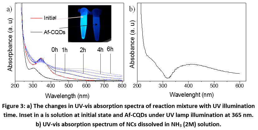 Figure 3: a) The changes in the UV-vis absorption spectra of the reaction mixture with UV illumination time. Inset in a is a solution at initial state and Af-CQDs under UV lamp illumination at 365 nm. b) UV-vis absorption spectrum of NCs dissolved in NH3 (2M) solution.