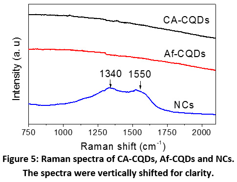 Figure 5: Raman spectra of CA-CQDs, Af-CQDs and NCs. The spectra were vertically shifted for clarity.