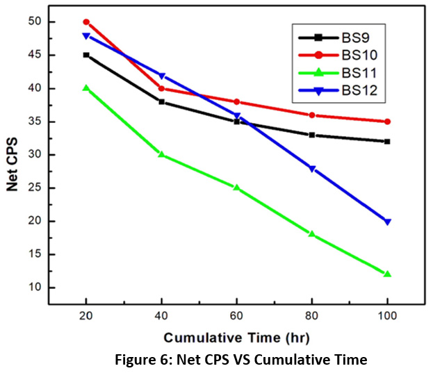 Leaching property was studied with the help of Soxhlet distillation apparatus. For glasses not containing uranium, the results of % wt. losses at each stage (time in hr.) were taken. The plot of % of wt. loss vs time is shown in fig 4 & 5. The ‘radiotracer technique’ (cps vs. cumulative time) was applied for uranium containing glasses along with wt. Loss data. Figure 6 shows the corresponding plots. From the plot it is observed that with increasing cumulative time, the net cps (alpha or beta) has decreased in an exponential way. This signifies that with increasing leaching time, the release of uranium along with other constituents becomes slower and slower until getting stopped. This indicates that the glass becomes resistant to leaching and is a better choice for the disposal of nuclear waste compared. In case of BS10 -BS12 glasses, a similar type of plot is obtained.