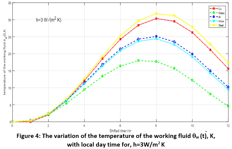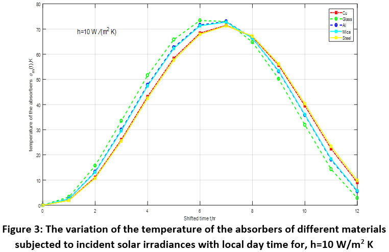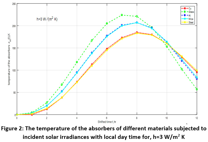Table 2: The variation of the temperature of the absorbers of different materials subjected to incident solar radiation for h=3 W/m2 K