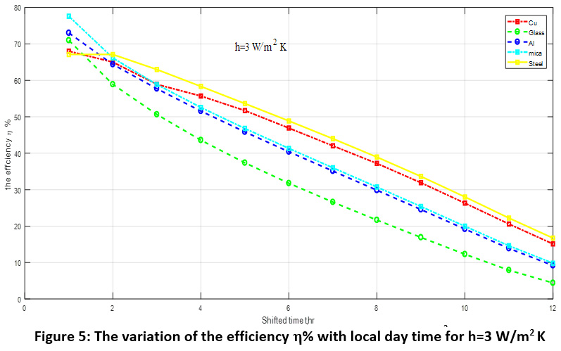 Figure 5: The variation of the efficiency η% with local day time for h=3 W/m2 K