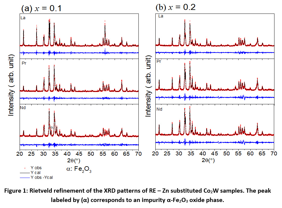 Table 1: Lattice parameters, cell volume, and X-ray density of Ba1-xRexCo2ZnxFe16-xO27 samples.